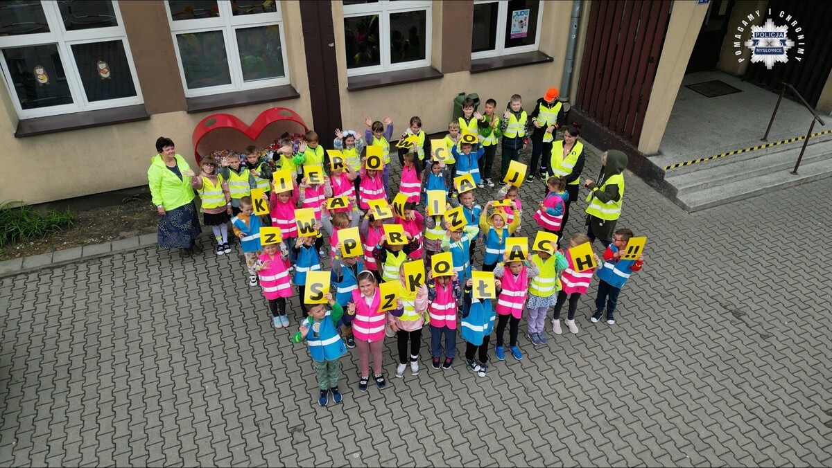 Policjanci wraz z dziećmi ze Szkoły Podstawowej numer 9 i 16 w Mysłowicach zapraszają do obejrzenia spotu, który promuje akcje "Bezpieczna droga do szkoły" i "Zwalniaj przy szkołach".