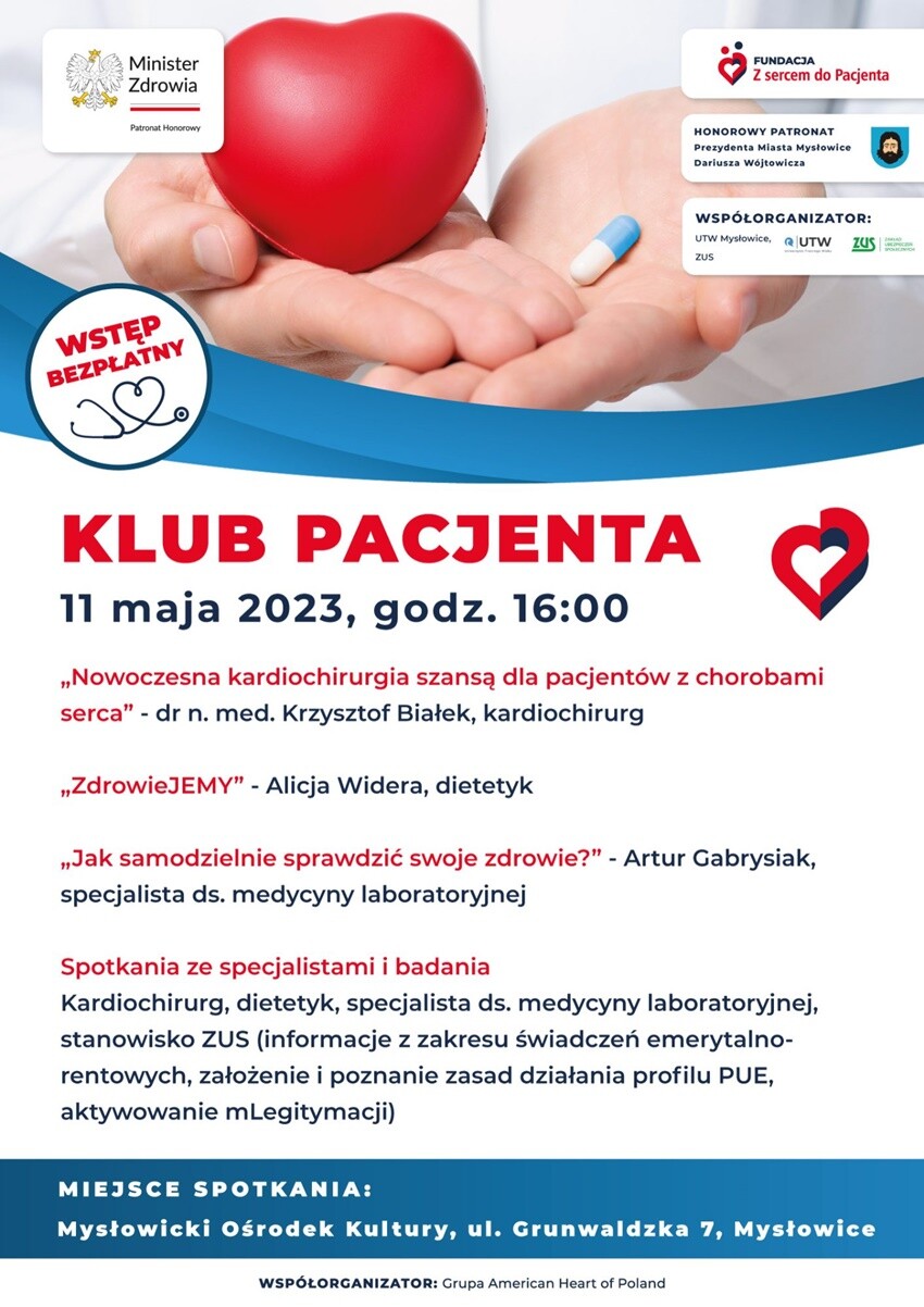 Fundacja "Z Sercem do Pacjenta” we współpracy z Uniwersytetem Trzeciego Wieku i ZUS zaprasza 11 maja br. o godz. 16:00 do Mysłowicki Ośrodek Kultury, ul. Grunwaldzka 7 na pierwszy w Mysłowicach Klub Pacjenta.