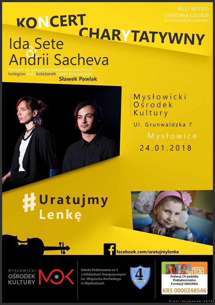 Kolejną okazją do finansowego wsparcia Lenki będzie koncert charytatywny, który zostanie zorganizowany 24 stycznia w Mysłowickim Ośrodku Kultury przy ul. Grunwaldzkiej 7. Podczas koncertu wystąpi młoda litewska (choć obecnie mieszkająca w Niemczech) wokalistka jazzowa Ida Sete, a także Andrii Sacheva – pochodzący z Ukrainy, a obecnie mieszkający w Katowicach muzyk jazzowy, skrzypek i kompozytor, absolwent Instytutu Jazzu na Akademii Muzycznej im. K. Szymanowskiego.