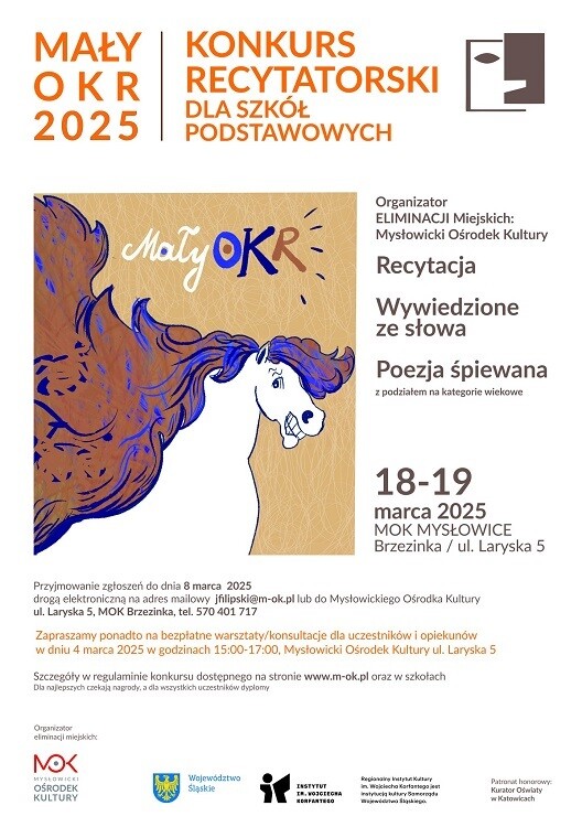 Mysłowicki Ośrodek Kultury zaprasza uczniów szkół podstawowych do udziału w Konkursie Recytatorskim Mały OKR 2025. Wydarzenie odbędzie się 18 i 19 marca w MOK Brzezinka (Kino Znicz, ul. Laryska 5).