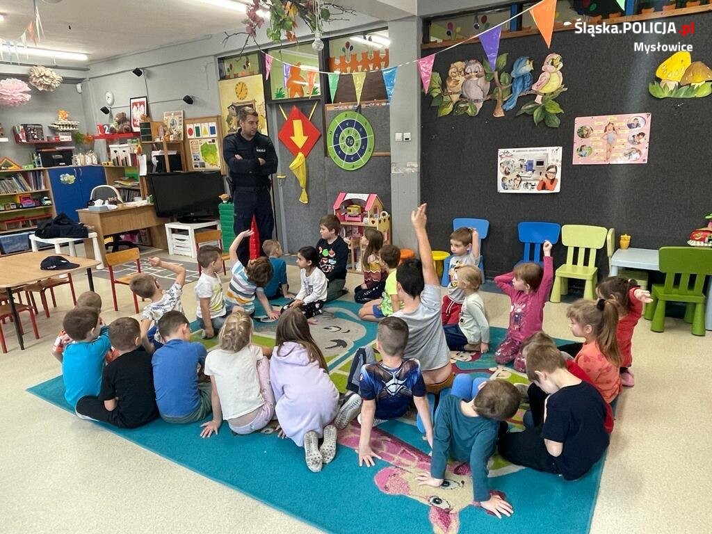 Dzielnicowi z mysłowickiej komendy spotkali się w poniedziałek z dziećmi z Przedszkola numer 12 w Mysłowicach. Wizyta była okazją do porozmawiania z przedszkolakami na temat bezpiecznego poruszania się w ruchu drogowym, znajomości numerów alarmowych oraz kontaktów z nieznajomymi.