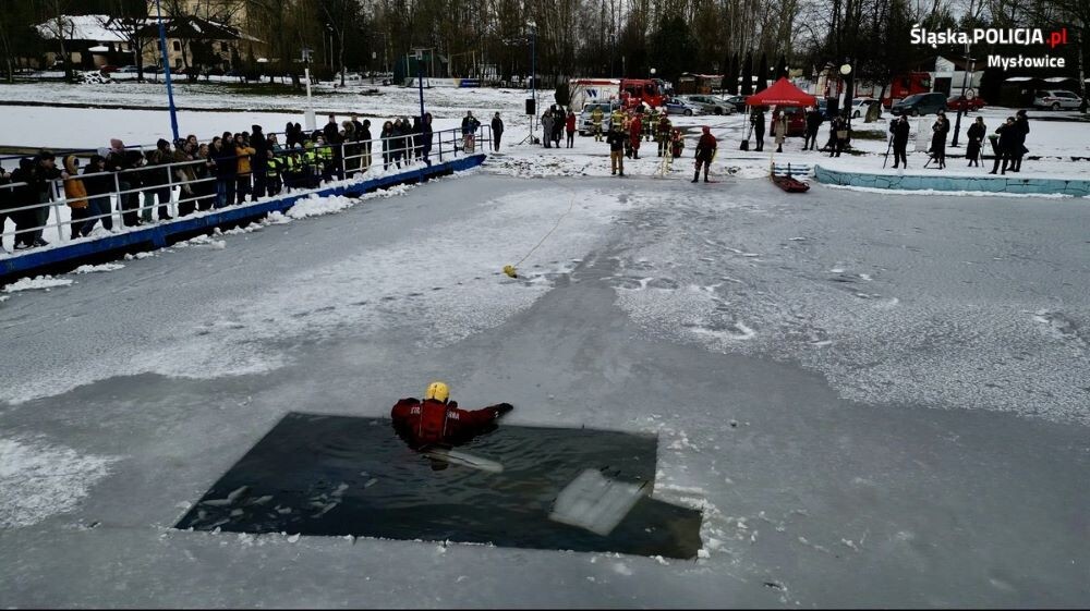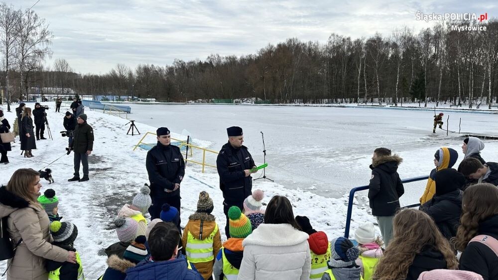 Mysłowiccy policjanci wraz ze strażakami z Państwowej Straży Pożarnej przeprowadzili dziś prelekcje oraz pokaz ratownictwa lodowego w Parku Słupna. Najmłodsi zostali zapoznani z zasadami bezpiecznej zabawy na śniegu i lodzie, czy przechodzenia przez jezdnię. Dzieciom posiadającym największą wiedzę z zakresu bezpieczeństwa wręczono elementy odblaskowe i inne gadżety.