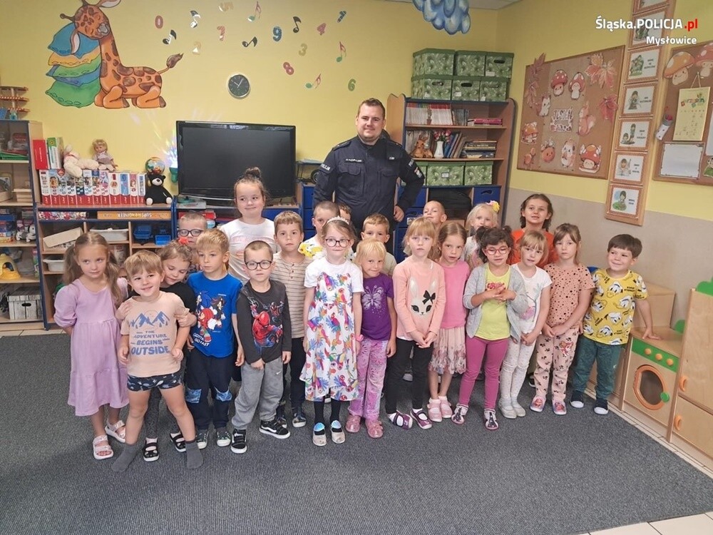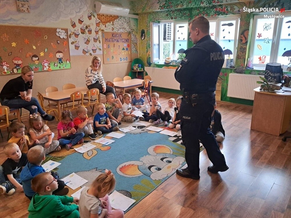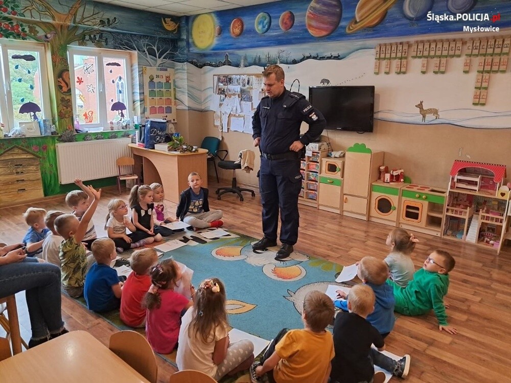 Policyjny profilaktyk z mysłowickiej jednostki spotkał się z dziećmi z Przedszkola "Motylek" oraz z przedszkola w dzielnicy Bończyk w Mysłowicach. Wizyta była okazją do porozmawiania z przedszkolakami na temat bezpiecznego poruszania się w ruchu drogowym, znajomości numerów alarmowych oraz kontaktów z nieznajomymi.