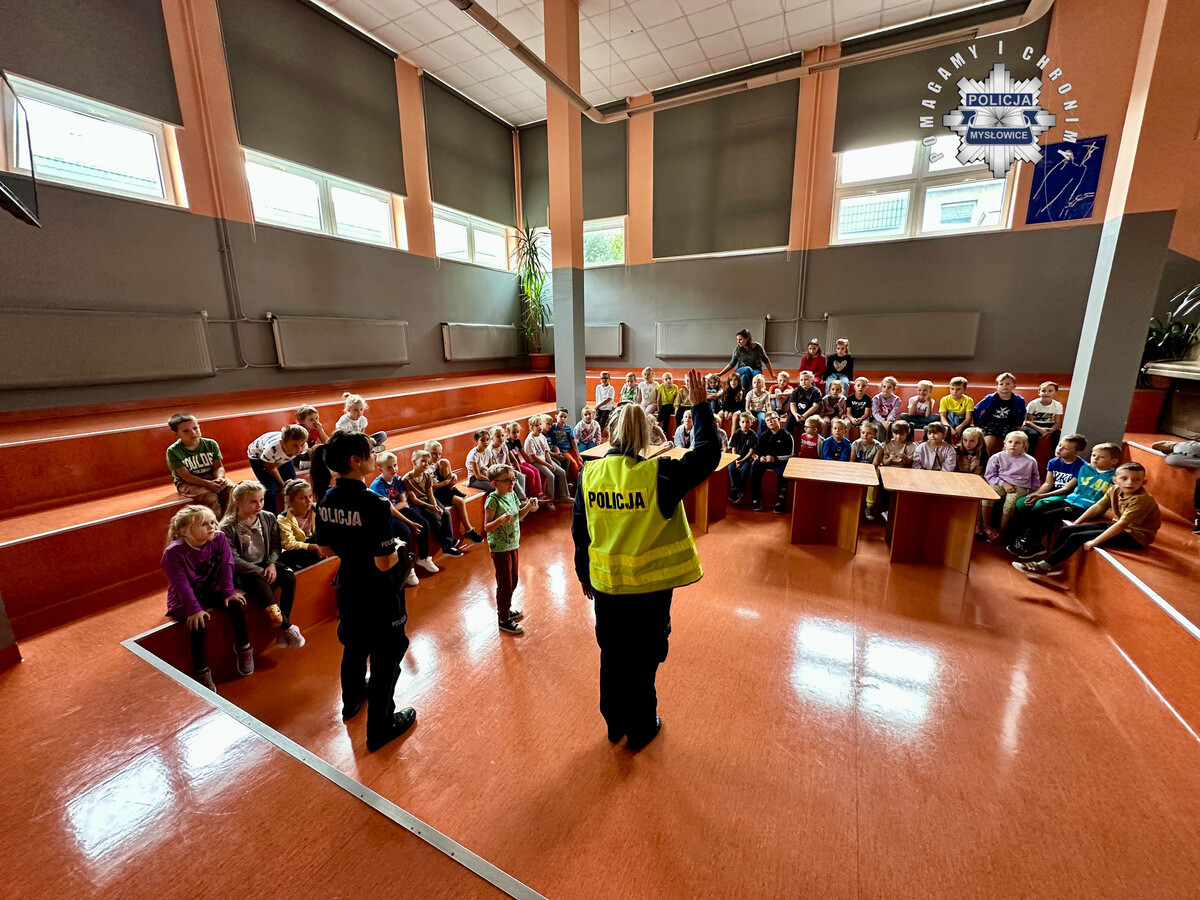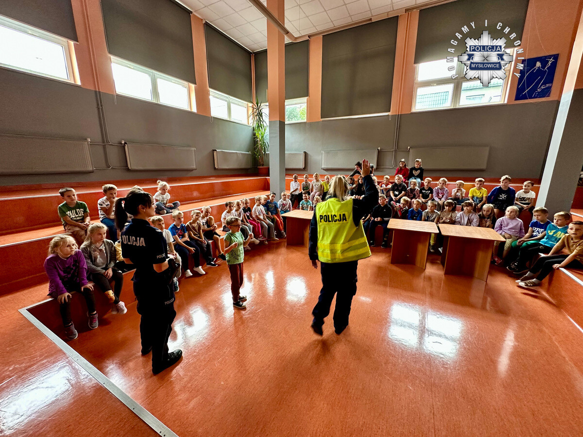 Policjantki zajmujące się profilaktyką odwiedziły w czwartek Szkołę Podstawową nr 17 w Mysłowicach, gdzie spotkały się z pierwszoklasistami. Mundurowe rozmawiały z dziećmi na temat bezpieczeństwa w trakcie drogi do szkoły, przypomniały im numery alarmowe oraz zasady i przypadki korzystania z nich, oraz odpowiedziały na pytania zgromadzonych dzieci.