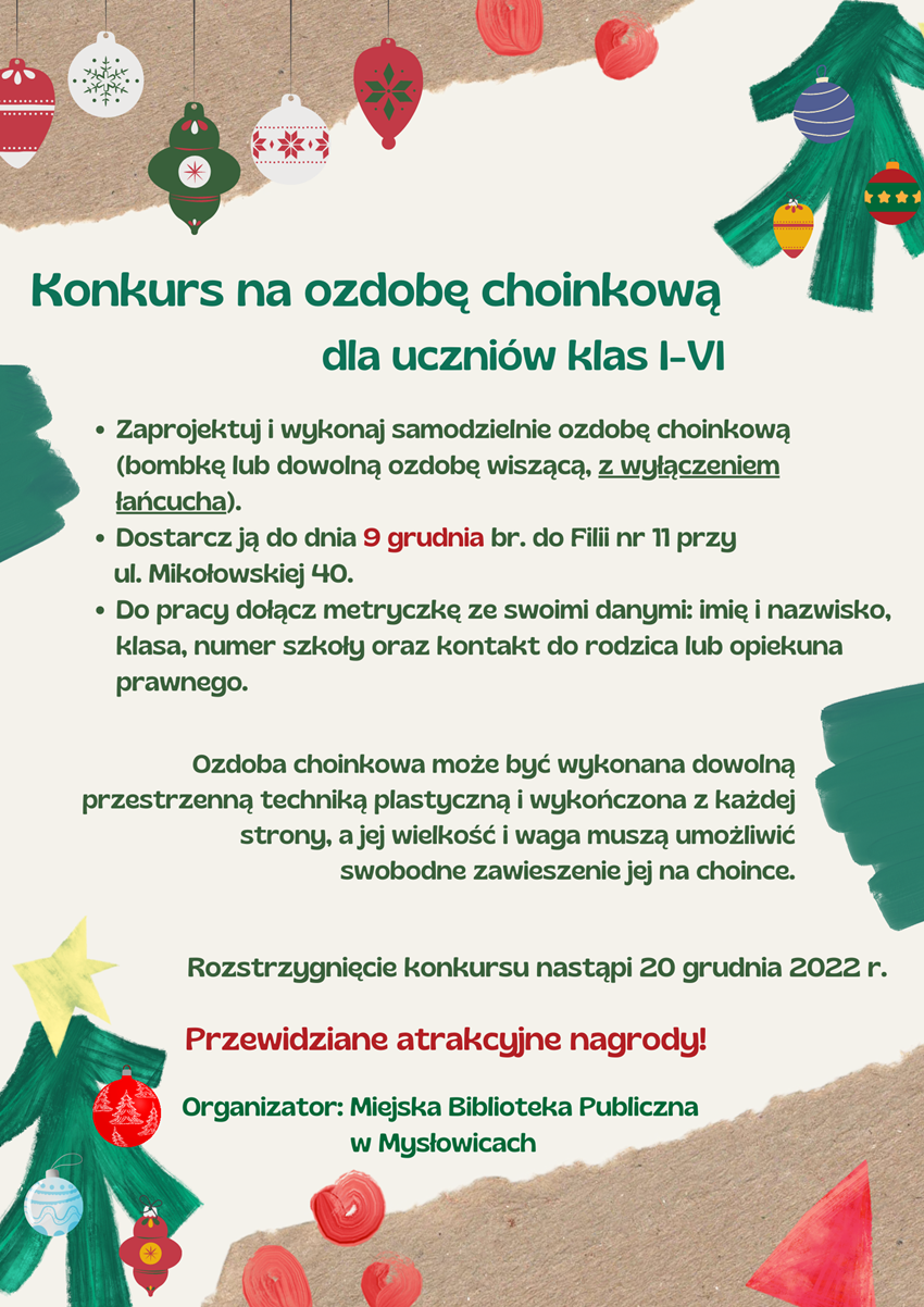Miejska biblioteka publiczna w Mysłowicach zaprasza do wzięcia udziału w konkursie na najlepszą ozdobę choinkową.