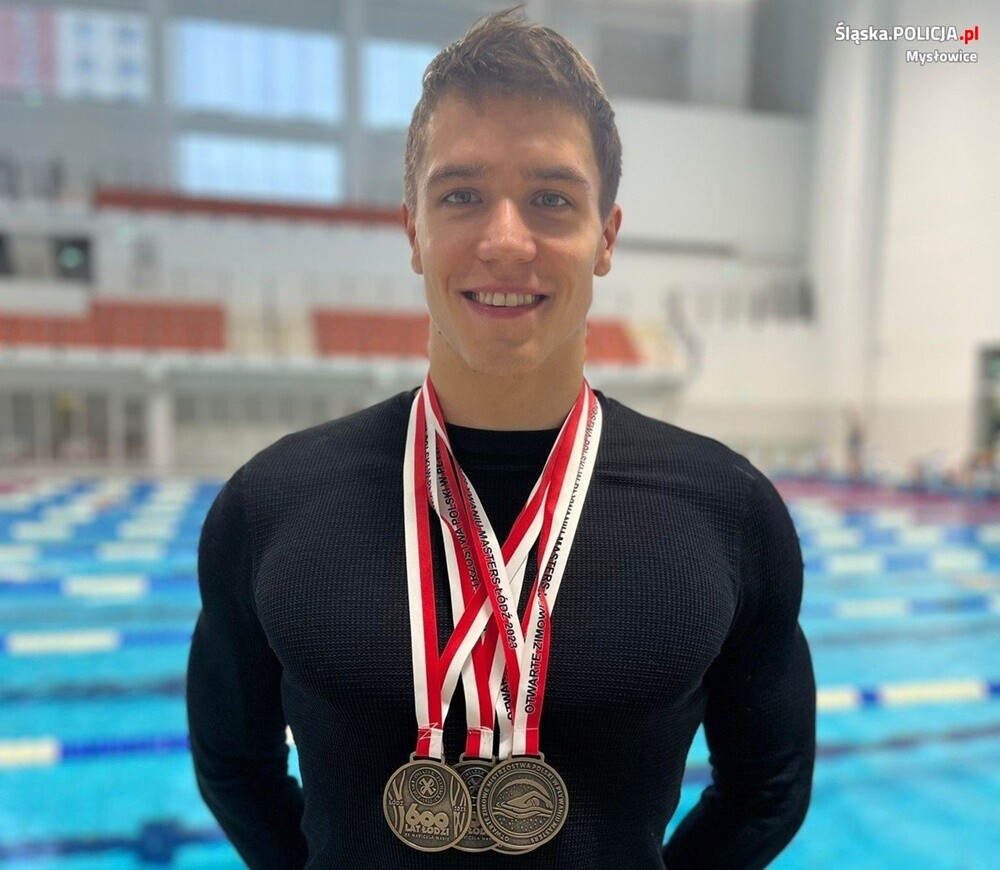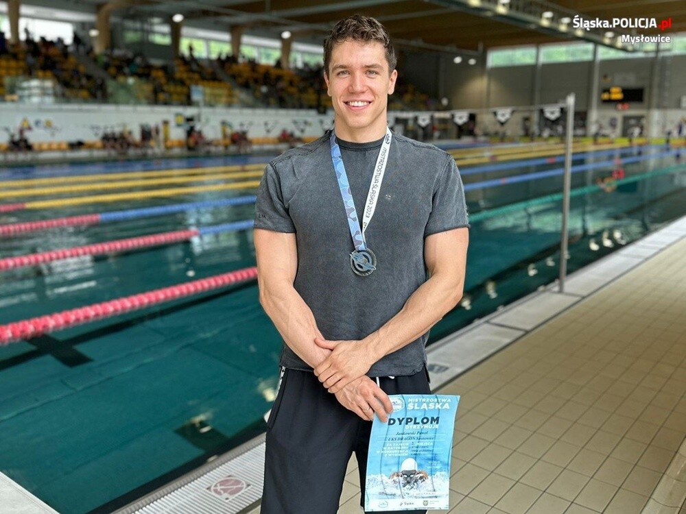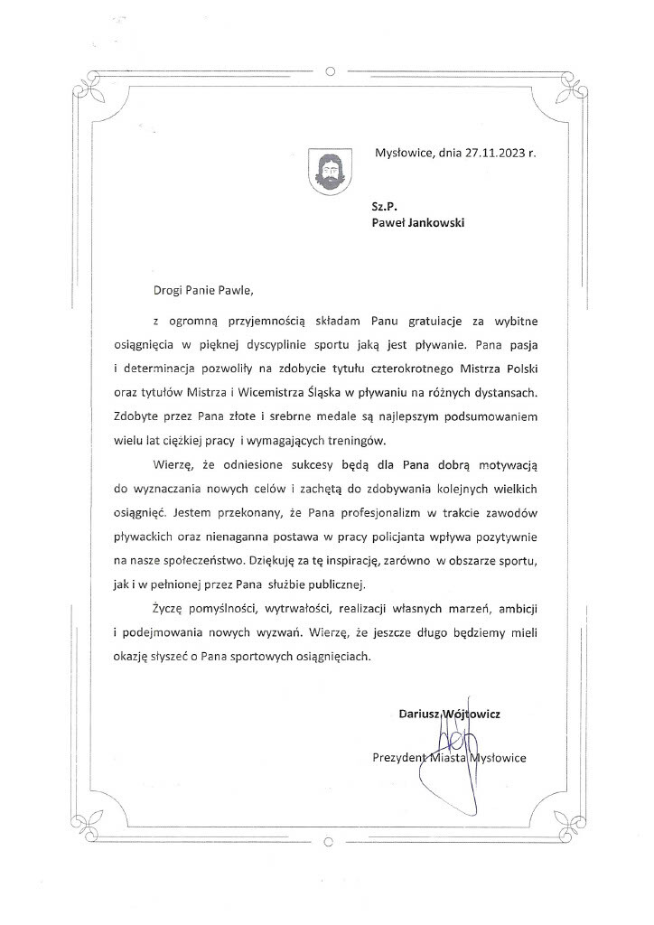 I Zastępca Prezydenta Miasta Mysłowice Wojciech Chmiel wręczył wczoraj w imieniu Prezydenta Mysłowic Dariusza Wójtowicza podziękowania i drobny upominek starszemu sierżantowi Pawłowi Jankowskiemu. Mysłowicki policjant został wyróżniony za swoje osiągnięcia sportowe. W ostatnim czasie został on czterokrotnym Mistrzem Polski, a także Mistrzem i Wicemistrzem Śląska w pływaniu. Prezydent podziękował policjantowi również za to, że tak doskonale łączy on sport z codzienną służbą dla mieszkańców Mysłowic.
