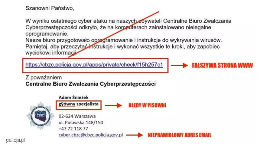 Centralne Biuro Zwalczania Cyberprzestępczości zwraca uwagę, że w treści wiadomości przesyłanej przez oszustów występują błędy w pisowni, podany jest nieprawidłowy adres mailowy, ponadto adres strony internetowej poprzedzony jest fałszywą frazą: troadsecow.com