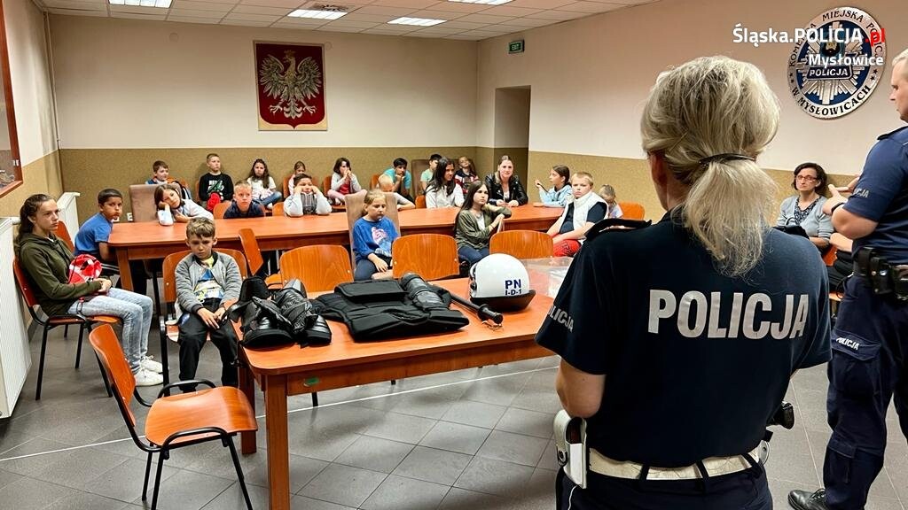 Mundurowi jak zwykle przygotowali dla dzieci sporo atrakcji. Zwiedzanie poprzedzone zostało jednak krótką prelekcją na temat bezpieczeństwa w ruchu drogowym oraz w trakcie wakacji. W sali odpraw mysłowickiej komendy stróże prawa przypominali uczniom zasady poruszania się po drogach oraz bezpiecznego wypoczynku zarówno nad morzem, jak i w górach. Po profilaktycznej pogadance dzieci ochoczo przymierzały policyjne wyposażenie wykorzystywane przez mundurowych podczas zabezpieczania imprez masowych.
