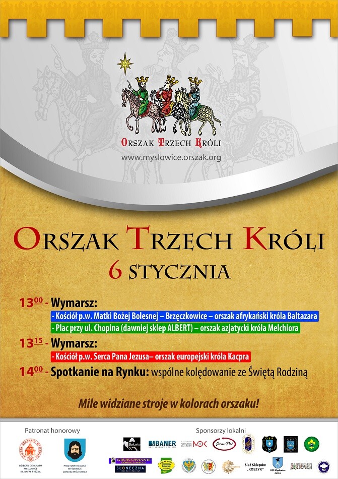 Orszaki spod kościoła p.w. Matki Boskiej Bolesnej w Brzęczkowicach - orszak afrykański króla Baltazara koloru niebieskiego, a także z placu przy ul. Chopina - orszak azjatycki króla Melchiora koloru zielonego wyruszą o godzinie 13:00, natomiast spod kościoła p.w. Serca Pana Jezusa w Centrum - orszak europejski króla Kacpra koloru czerwonego o godzinie 13:15.