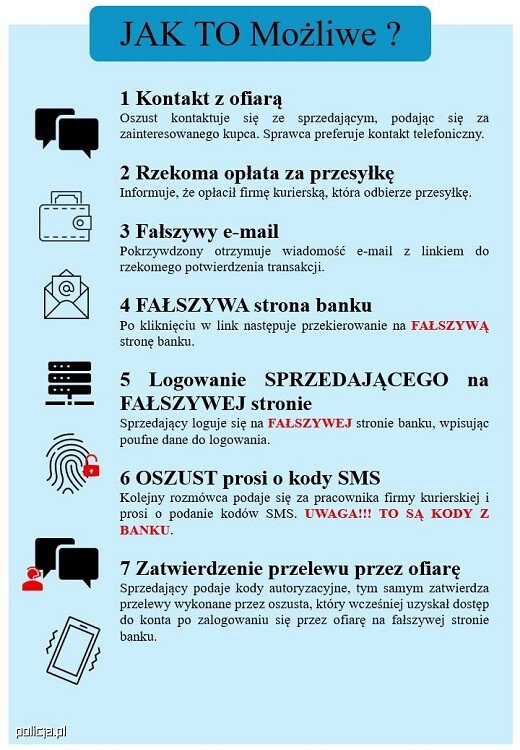Sprzedający, podając kody autoryzacyjne, zatwierdza przelewy dokonane przez oszusta, który wcześniej uzyskał dostęp do konta ofiary.