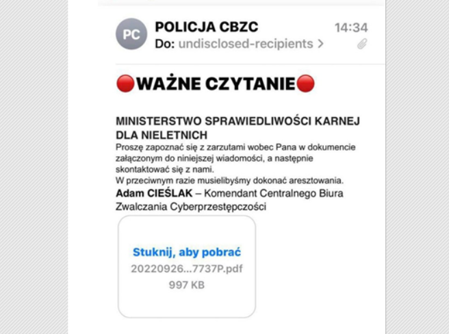 W celu uwiarygodnienia swojej wiadomości przestępcy podpisują się jako Komendant Centralnego Biura Zwalczania Cyberprzestępczości – Adam Cieślak.