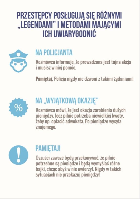 Zwracamy się też z apelem, zwłaszcza do członków rodziny i krewnych - informujmy naszych rodziców i dziadków o tym, że są osoby, które mogą chcieć wykorzystać ich łatwowierność. Powiedzmy im jak zachować się w sytuacji kiedy ktoś zadzwoni do nich z prośbą o przekazanie dużej ilości pieniędzy. Zwróćmy uwagę na zagrożenie osobom starszym, o których wiemy, że mieszkają samotnie. Wykorzystujmy okolicznościowe, a nawet przypadkowe spotkania na ulicy do ostrzegania bliskich przed zagrożeniami.