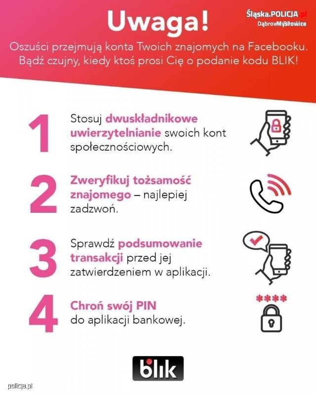 Mysłowiccy policjanci kolejny raz przestrzegają przed oszustwami z wykorzystaniem kodu BLIK. Kiedy ktoś pisze przez internetowy komunikator, że potrzebuje szybkiej pomocy finansowej i prosi o podanie kodu do płatności mobilnych (BLIK), należy zachować szczególną ostrożność.