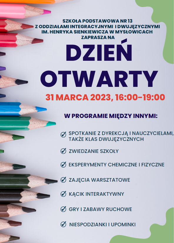 Dyrekcja oraz Grono Pedagogiczne Szkoły Podstawowej nr 13 w Mysłowicach serdecznie zapraszają przyszłych pierwszoklasistów wraz z opiekunami na Dzień Otwarty, który odbędzie się 31 marca 2023 r. w godzinach 16.00-19.00.