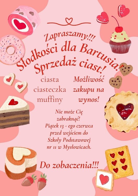 Już w piątek 13 czerwca od godziny 9:00 w Szkole Podstawowej nr 11 na Laryszu w Mysłowicach odbędzie się wyjątkowy kiermasz wypieków, którego celem jest wsparcie leczenia Bartusia Bańskiego. Dochód z tej akcji zostanie w całości przekazany na leczenie małego mieszkańca Mysłowic.