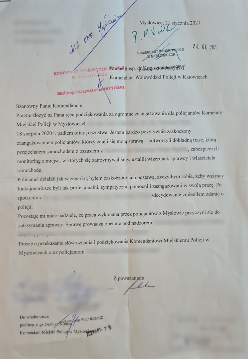 Jego sprawą zajęli się policjanci Wydziału Kryminalnego. Stróże prawa wykonując swoje obowiązki wywarli tak pozytywne wrażenie na mysłowiczaninie, że mężczyzna pod koniec stycznia br. przesłał na ręce ówczesnego Komendanta Wojewódzkiego Policji w Katowicach nadinsp. dr Krzysztofa Justyńskiego podziękowania. W swoim liście podkreśla ogromne zaangażowanie policjantów oraz ich profesjonalizm.