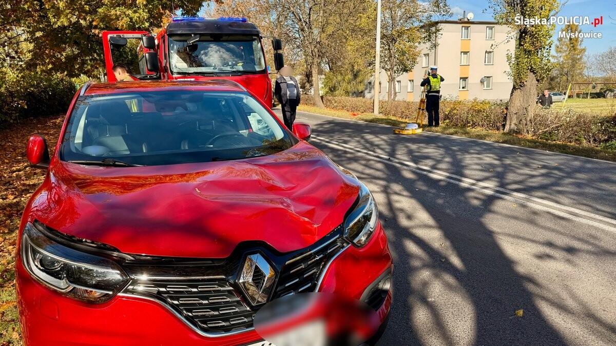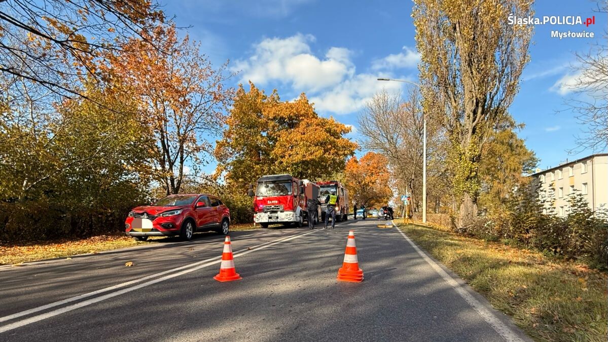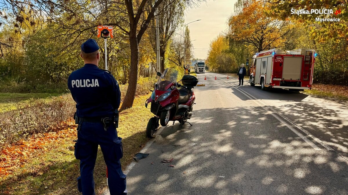 Jadący za renault 51-letni mieszkaniec Mysłowic chciał uniknąć najechania na tył renault, w wyniku czego utracił panowanie nad skuterem i upadł na jezdnię. Mundurowi zbadali trzeźwość uczestników zdarzenia, żaden z nich nie znajdował się pod wpływem alkoholu. Pieszy z obrażeniami głowy został zabrany przez zespół ratownictwa medycznego do szpitala. Na badania trafił również kierujący skuterem, który uskarżał się na ból żeber.