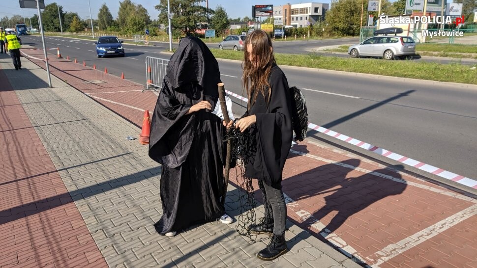 Między innymi dlatego w piątek przy ul. Obrzeżnej Północnej policjanci z Wydziałów Ruchu Drogowego KMP w Mysłowicach i KWP w Katowicach oraz przedstawicielami Automobilklubu Mysłowickiego przygotowali pokaz pn. "Prędkość i hamowanie". W pokazie udział wziął poszkodowany w wypadku rowerzysta, a gościem specjalnym wydarzenia był perkusista m.in. zespołu Myslovitz Wojtek Kuderski. Ubrana na czarno młodzież z I LO w Mysłowicach na transparentach prezentowała policyjne statystyki zdarzeń drogowych. Dodatkowym akcentem pokazu była trumna i worek, które symbolizowały dwie ofiary śmiertelne wypadków na drogach naszego miasta. Celem przeprowadzonych działań było wyrobienie wśród uczestników ruchu drogowego nawyku konieczności zachowania szczególnej ostrożności w rejonie przejść dla pieszych i dostosowania prędkości pojazdu do obowiązujących ograniczeń oraz warunków na drodze. Zgromadzeni na pokazie widzowie mogli zobaczyć jak zmienia się droga hamowania pojazdu w zależności od stanu nawierzchni drogi, a także od prędkości z jaką się porusza. W trakcie spotkania organizatorzy zwrócili też uwagę na niebezpieczne zachowania rowerzystów i przypomnieli zasady bezpiecznego poruszania się po drodze oraz przechodzenia przez przejście dla pieszych.