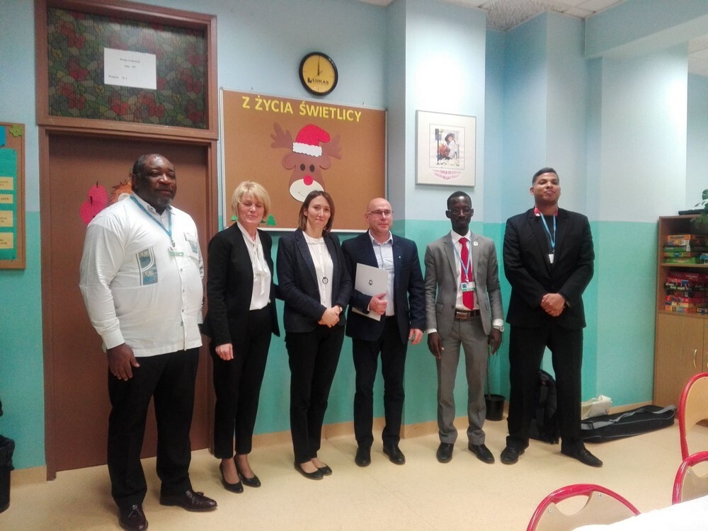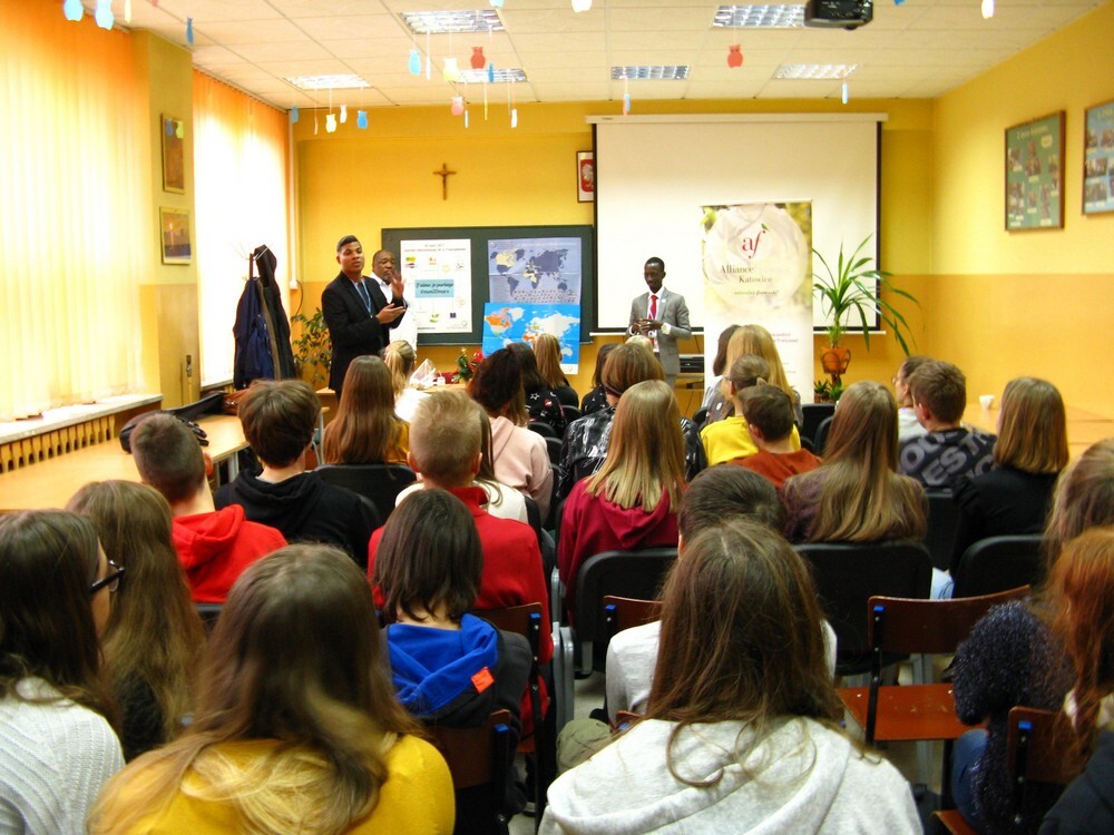 Dzięki współpracy z Panem Stephane Jolivet, Dyrektorem Ośrodka Alliance Française w Katowicach, 14 grudnia z wizytą do szkoły przybyli przedstawiciele Międzynarodowej Organizacji Frankofonii, odpowiedzialni za realizację programu zrównoważonego rozwoju: Pan Jean-Pierre Ndoutoum Directeur de l'Institut de la Francophonie pour le développement durable (IFDD) oraz Pan Issa Bado Attaché de programme Négociations internationales sur l’économie, l’environnement et le développement durable, biorący udział Szczycie Klimatycznym w Katowicach (COP24).