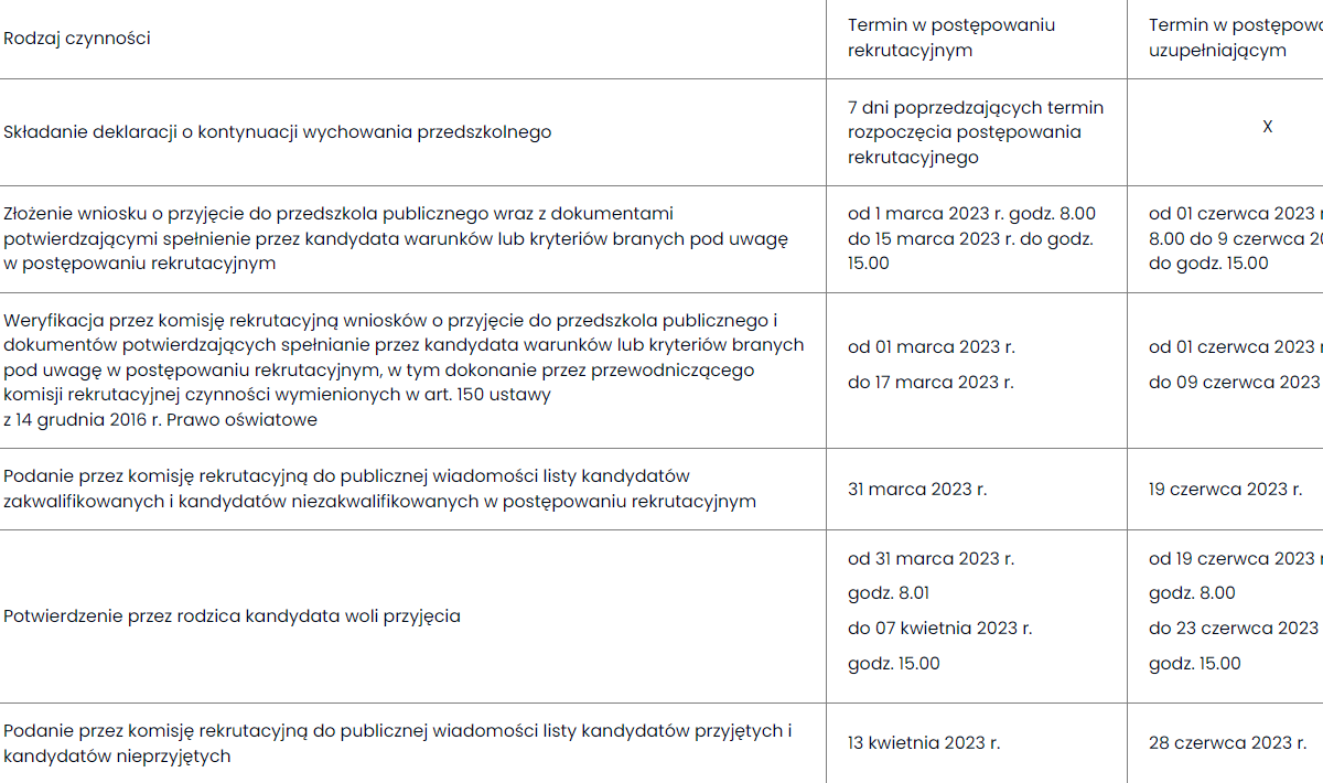 Poniżej publikuje się termin rekrutacji do przedszkoli i kryteria brane pod uwagę w postępowaniu rekrutacyjnym na rok szkolny 2023/2024 oraz dokumenty niezbędne do potwierdzenia spełnienia tych kryteriów .