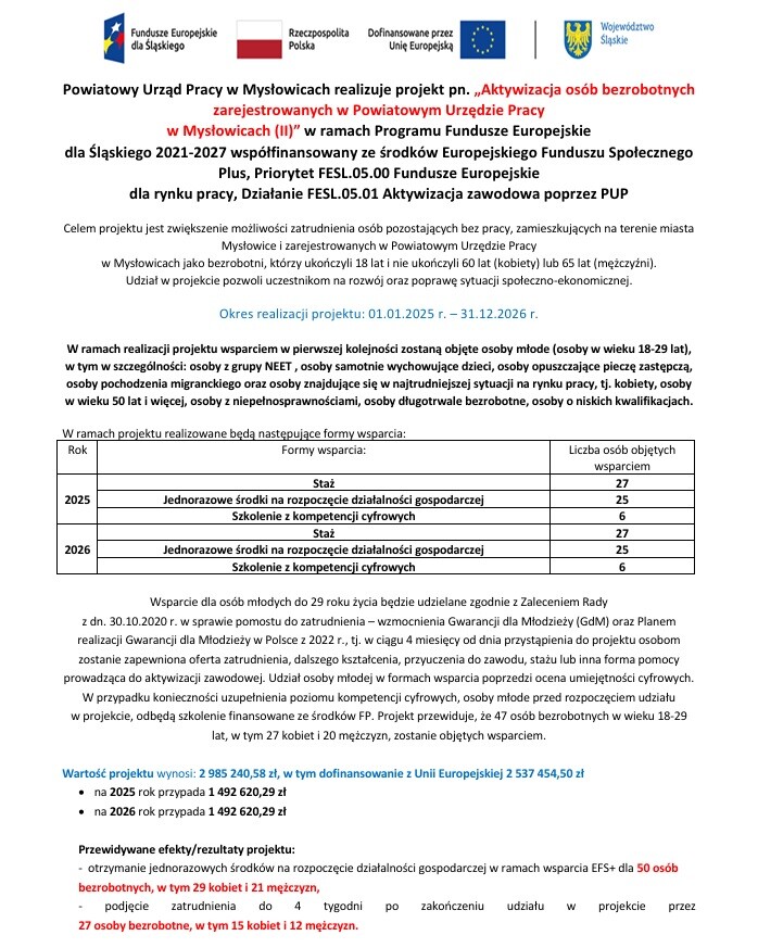 Powiatowy Urząd Pracy w Mysłowicach ogłasza nabory wniosków w ramach projektu „Aktywizacja osób bezrobotnych zarejestrowanych w PUP w Mysłowicach (II)”, realizowanego w ramach programu Fundusze Europejskie dla Śląskiego 2021–2027, współfinansowanego ze środków Europejskiego Funduszu Społecznego Plus.
