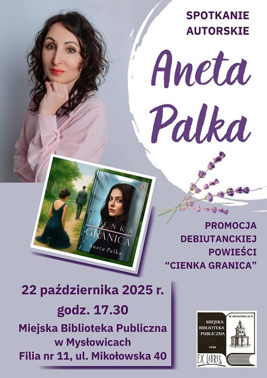 Już 22 października o godzinie 17:30 w Filia nr 11 Miejskiej Biblioteki Publicznej przy ul. Mikołowskiej 40 w Mysłowicach odbędzie się spotkanie autorskie z Anetą Palką, które będzie promować jej debiutancką powieść pt. „Cienka granica”.