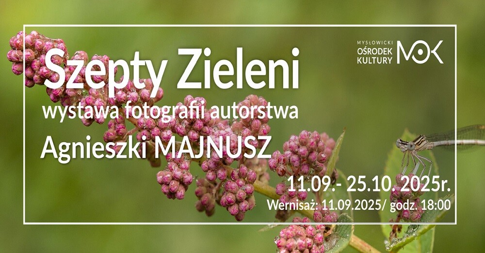 Mysłowicki Ośrodek Kultury zaprasza na wystawę fotografii Agnieszki Majnusz (Agus May) pt. „Szepty zieleni”. Ekspozycja będzie dostępna w Galerii Małej od 11 września do 25 października. Uroczysty wernisaż zaplanowano na 11 września o godzinie 18:00.