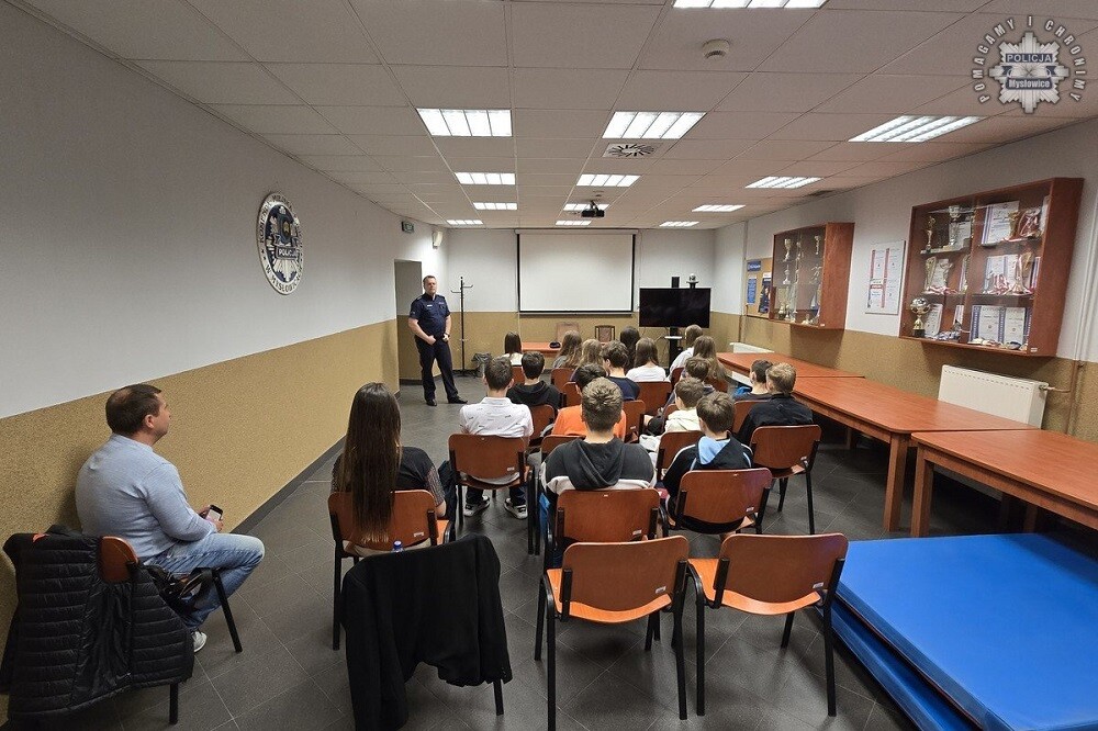 W środę, 21 maja, uczniowie klasy szóstej Szkoły Podstawowej nr 4 w Mysłowicach odwiedzili Komendę Miejską Policji. Dzieci oprowadzał po budynku asp. sztab. Dariusz Opatrzyk, dzielnicowy z dzielnicy Janów, który pokazał im, jak wygląda codzienna służba funkcjonariuszy oraz ich wyposażenie.