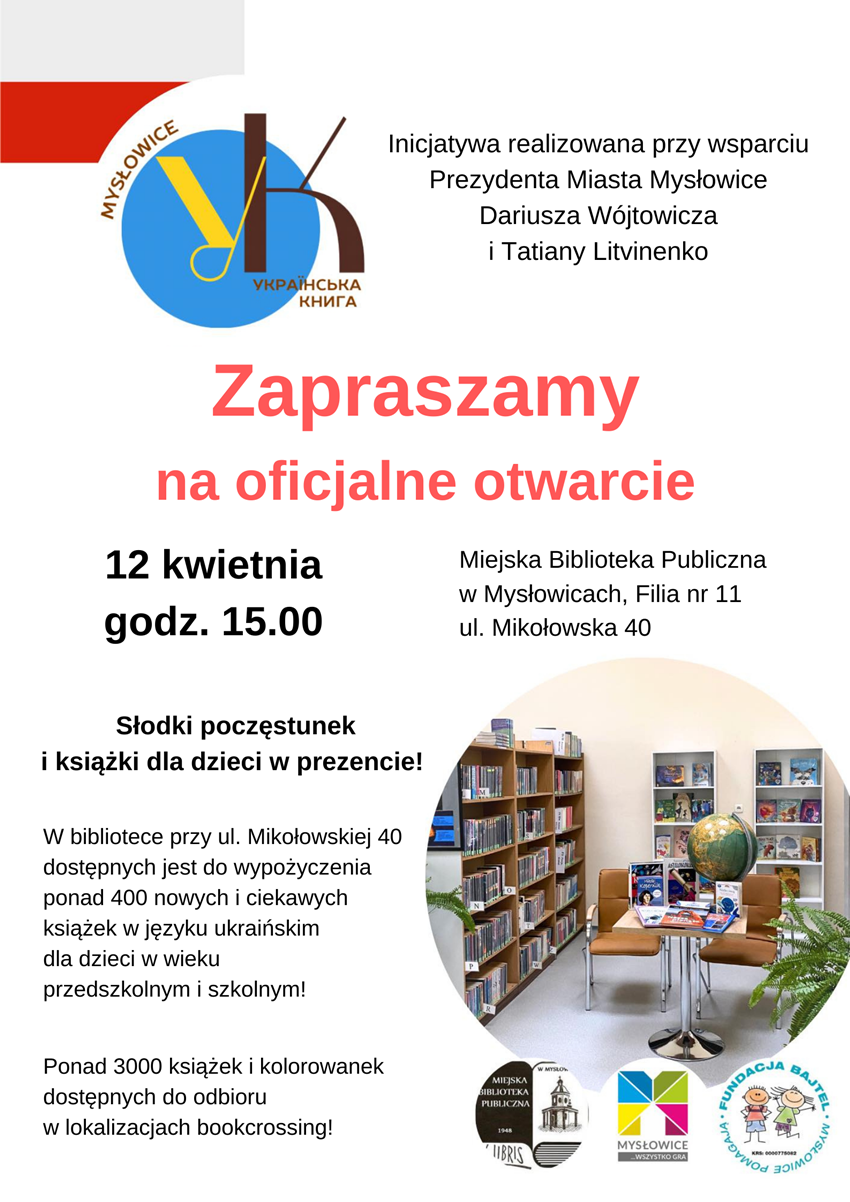 W związku z powyższym zaprasza się na oficjalne otwarcie 12 kwietnia o godz. 15.00 w Filii nr 11 przy ul. Mikołowskiej 40. Czeka wiele atrakcji: słodki poczęstunek, ukraińskie książki w prezencie, warsztaty dla dzieci, konkursy. Będzie się działo!