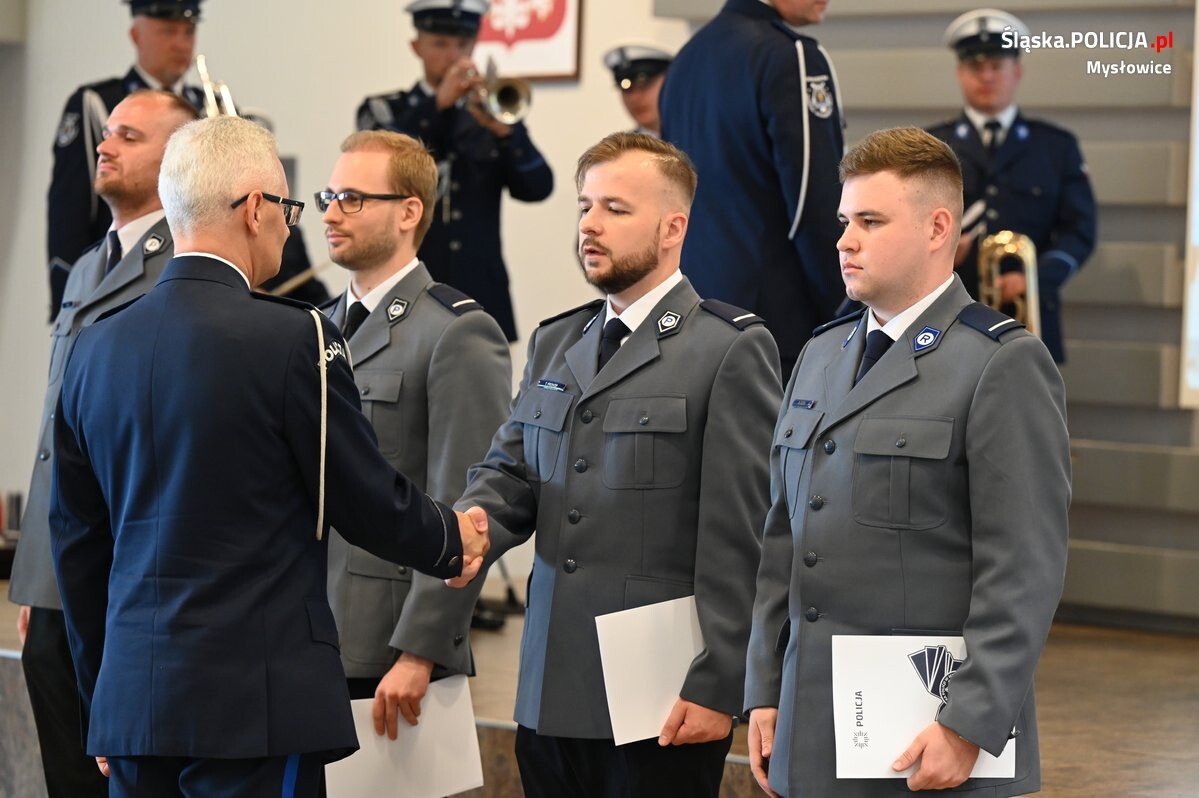 Święto Policji to także okazja do mianowania policjantów na wyższe stopnie służbowe za ich codzienną, sumienną i ciężką służbę. W tym roku nowe dystynkcje otrzymało 34 mysłowickich policjantów, w tym 6 mianowanych przedterminowo w drodze wyróżnienia za wzorowe wykonywanie obowiązków, przejawianie inicjatywy w służbie oraz doskonalenie zawodowe. Akty mianowania na wyższe stopnie służbowe wręczał I Zastępca Komendanta Wojewódzkiego Policji w Katowicach inspektor Mariusz Krzystyniak w asyście Szefa mysłowickich policjantów.