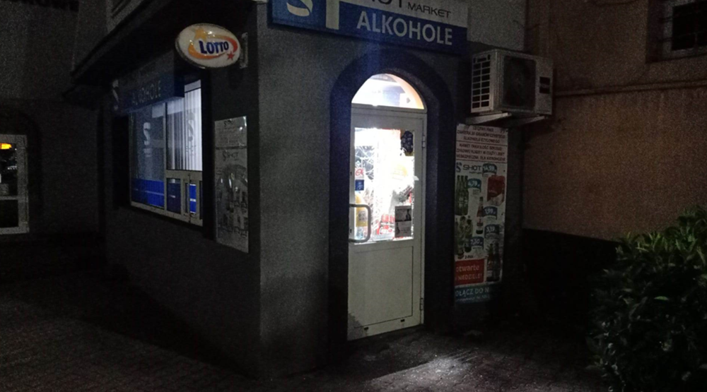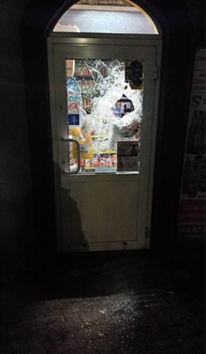 Młodzi mężczyźni na widok radiowozu uciekli do jednego z mieszkań przy ul. Słupeckiej. W związku z powyższym faktem, funkcjonariusze dokonali kontroli placówek handlowych i ujawnili wybitą szybę w drzwiach wejściowych w/w sklepu. Wybity otwór miał średnicę ok. 20 cm, a wewnątrz sklepu leżała połowa cegły.