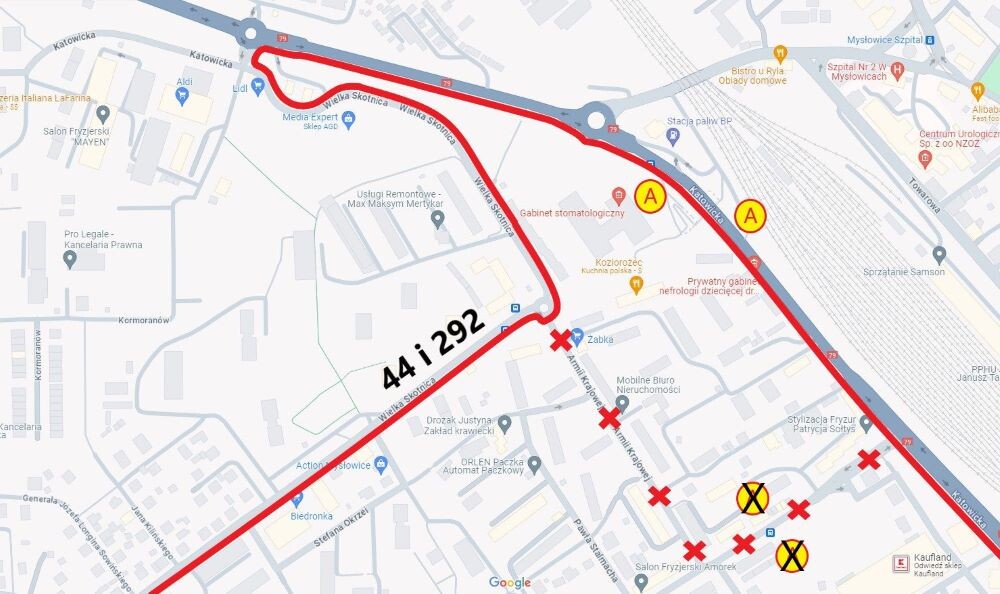 W związku z informacją firmy Eurowia Polska S. A. o rozpoczęciu realizacji zadania „Kompleksowa przebudowa ul. Armii Krajowej, Reymonta, Wyspiańskiego, Prusa Mickiewicza, Lompy, Wojska Polskiego z łącznikiem z ul. Wyspiańskiego w Mysłowicach” Zarząd Transportu Metropolitalnego informuje, że od dnia 10 kwietnia 2024 r. (środa) do odwołania wprowadza się zmiany trasy przejazdu dla linii autobusowych: 44 i 292.