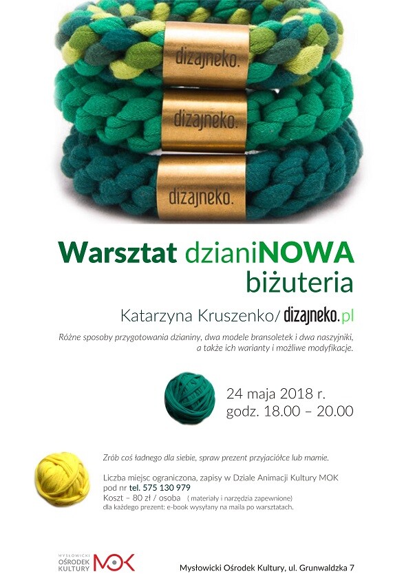 Przyjdź na warsztaty dzianiNOWE, na których poznasz kilka prostych, a zarazem wciągających i relaksujących sposobów na wykonanie biżuterii. Na warsztatach pokażemy, jak z dostępnych w każdym domu materiałów, wykonać piękne i wygodne dodatki. I to w duchu upcyklingu – użyjemy pociętych bawełnianych koszulek i ścinków dzianin ze szwalni, które na co dzień Kasia Kruszenko wykorzystuje do produkcji autorskiej biżuterii. Dzianiny na pewno nam nie zabraknie, możesz jednak przynieść swoje niepotrzebne koszulki czy sukienki, jeśli np. zależy Ci na ulubionym kolorze czy wzorze. W sklepach jest dziś wszystko i nic, dlatego rękodzieło wzbudza zachwyt i zaciekawienie. Rzeczy, które wykonamy idealnie nadają się na prezent i ożywienie własnej garderoby na wiosnę. Pokażemy sposoby przygotowania dzianiny, dwa modele bransoletek i dwa naszyjniki,a także ich warianty i możliwe modyfikacje.