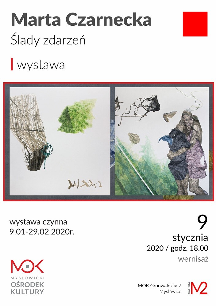Tym razem w Galerii M2 Mysłowickiego Ośrodka Kultury pojawi się seria obrazów Marty Czarneckiej pt. „Ślady zdarzeń” opowiadająca o zdarzeniach autobiograficznych zapisanych w pamięci oraz tworzących się pomiędzy nimi relacjach.
