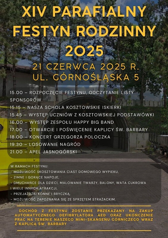 W sobotę o godz. 15:00 przy ul. Górnośląskiej 5 w Kosztowach rozpocznie się XIV Parafialny Festyn Rodzinny. To jedno z najbardziej wyczekiwanych wydarzeń w parafii – pełne muzyki, atrakcji dla całych rodzin oraz ważnego celu społecznego.