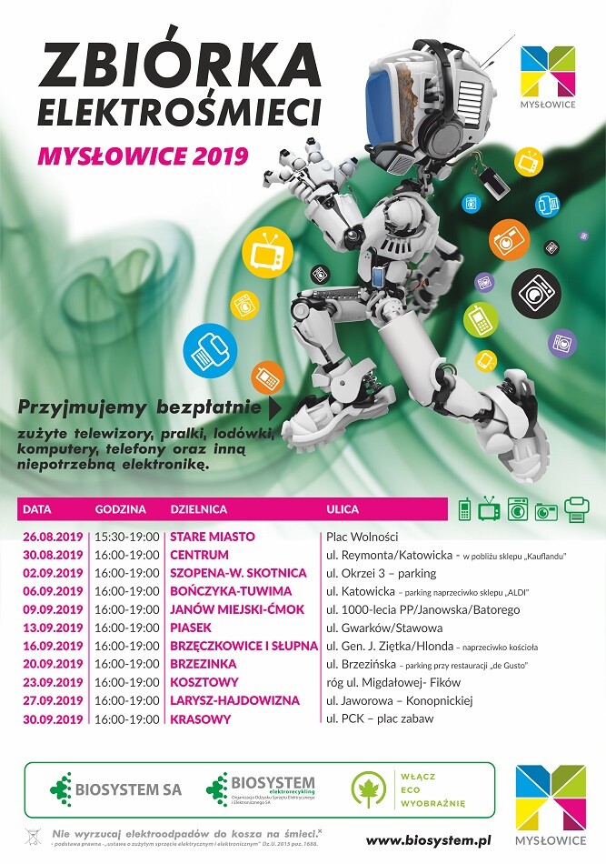 Szczegółowy harmonogram zbiórek elektroodpadów w Mysłowicach w okresie od 26 sierpnia do 14 października 2019 roku: