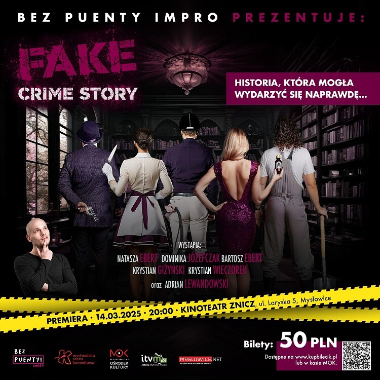 Miłośnicy kryminałów i teatru improwizowanego powinni zaznaczyć tę datę w kalendarzu – 14 marca na scenie KinoTeatru „Znicz” w Mysłowicach odbędzie się premiera spektaklu „Fake Crime Story” w wykonaniu grupy Bez Puenty Impro. Widzowie będą świadkami jedynej w swoim rodzaju kryminalnej historii, która powstanie na ich oczach – pełnej napięcia, zwrotów akcji i nieprzewidywalnych rozwiązań.