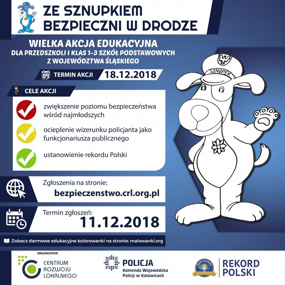 Komenda Wojewódzka Policji w Katowicach we współpracy z Centrum Rozwoju Lokalnego z Zawiercia organizuje na terenie województwa śląskiego akcję edukacyjną dla najmłodszych „Ze Sznupkiem bezpieczni w drodze„ podejmującą tematykę bezpieczeństwa na drodze.